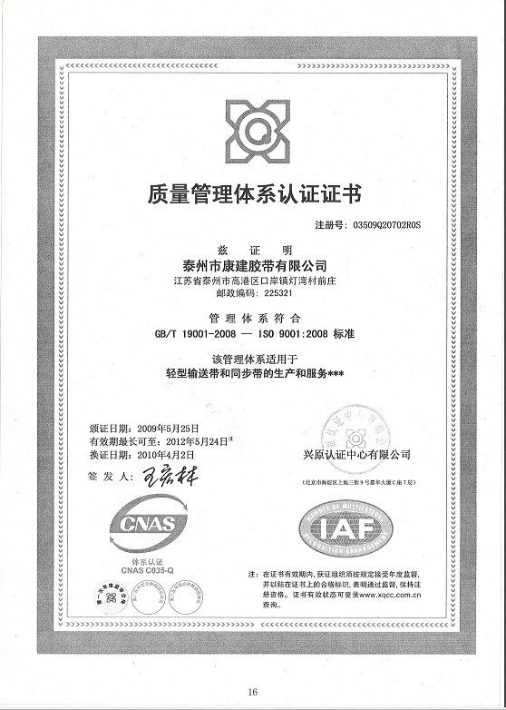 泰州市康建膠帶有限公司經(jīng)過(guò)十多年的發(fā)展已經(jīng)成為一家從事輸送帶和傳動(dòng)帶類(lèi)及相關(guān)設(shè)備生產(chǎn)和銷(xiāo)售的公司。位于中國(guó)經(jīng)濟(jì)發(fā)達(dá)的長(zhǎng)三角經(jīng)濟(jì)圈江蘇省泰州市高港區(qū),交通發(fā)達(dá)。我司以“合格的產(chǎn)品,滿(mǎn)意的服務(wù)”為宗旨,發(fā)揚(yáng)團(tuán)結(jié)、開(kāi)拓、拼搏爭(zhēng)先的創(chuàng)業(yè)精神,“康建”在全國(guó)行業(yè)樹(shù)立了良好的企業(yè)形象。“康建”產(chǎn)品已通過(guò)ISO9001國(guó)際質(zhì)量體系認(rèn)證,從原料﹑工藝等方面進(jìn)行了嚴(yán)格的控制,從而確保了產(chǎn)品質(zhì)量的穩(wěn)定可靠,成為各......